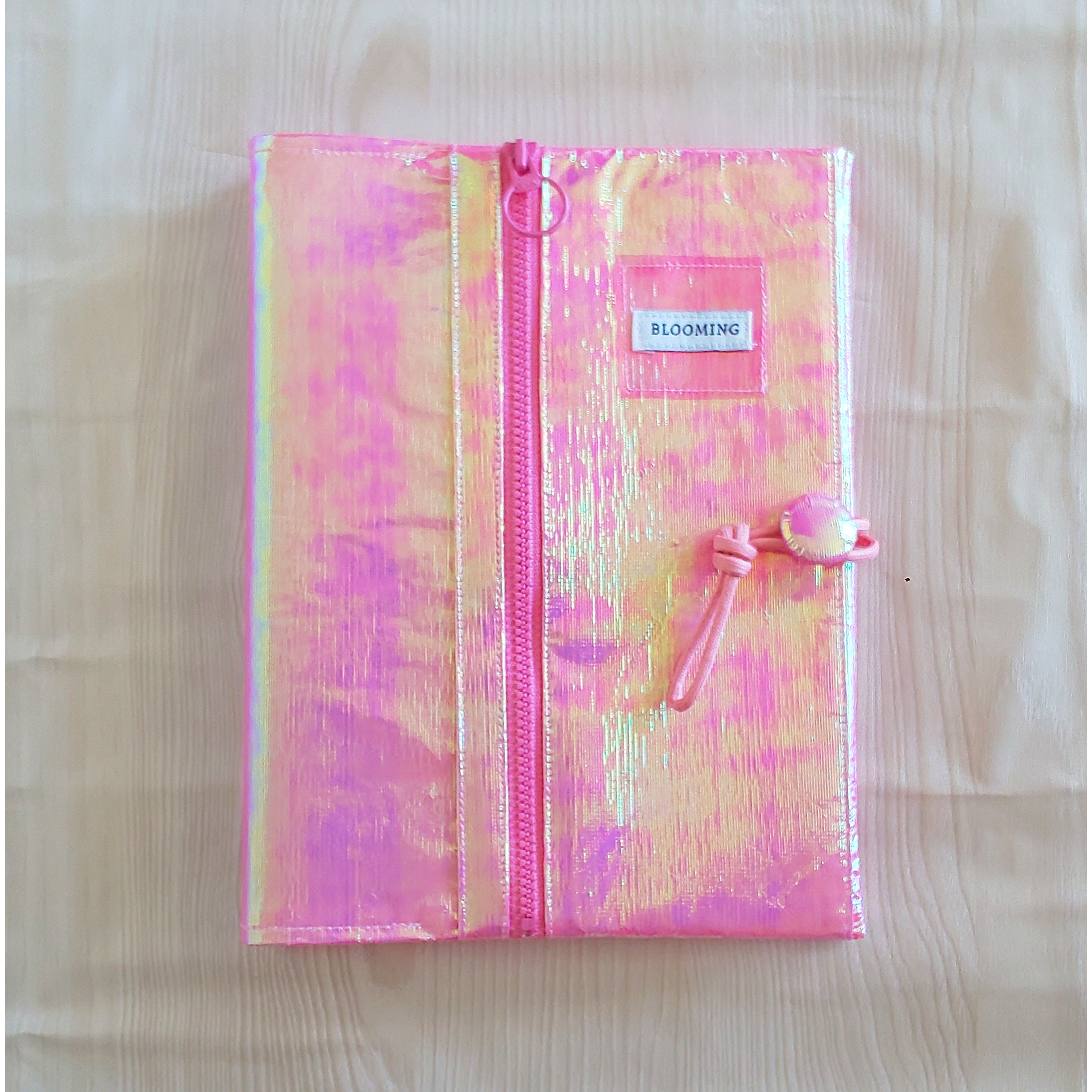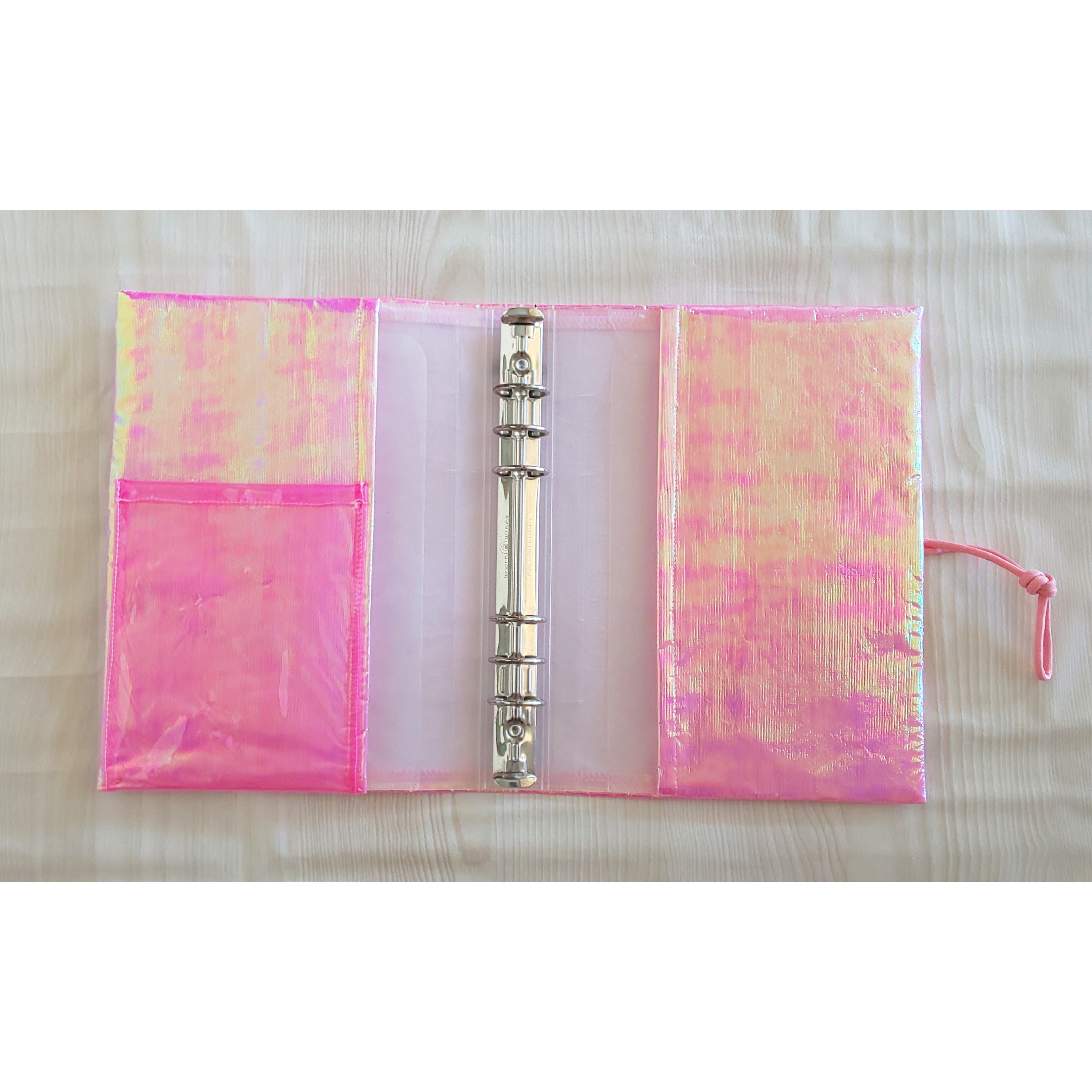 柄など…オーロラみたいに光沢のあるピンク、ポケット部分は、透明のビニール生地